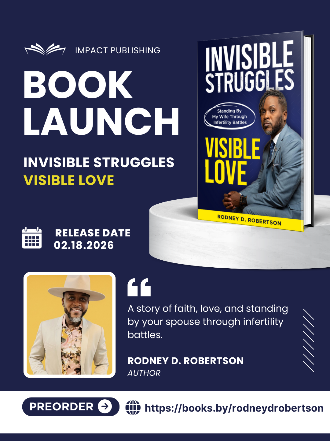 In Invisible Struggles, Visible Love, author and husband, Rodney D. Robertson, shares a raw and redemptive journey of walking beside his wife through the unspoken heartbreak of infertility. With honesty, vulnerability, and deep spiritual insight, Rodney gives voice to the silent pain many men experience—but rarely express—when dreams of parenthood are delayed or denied.
